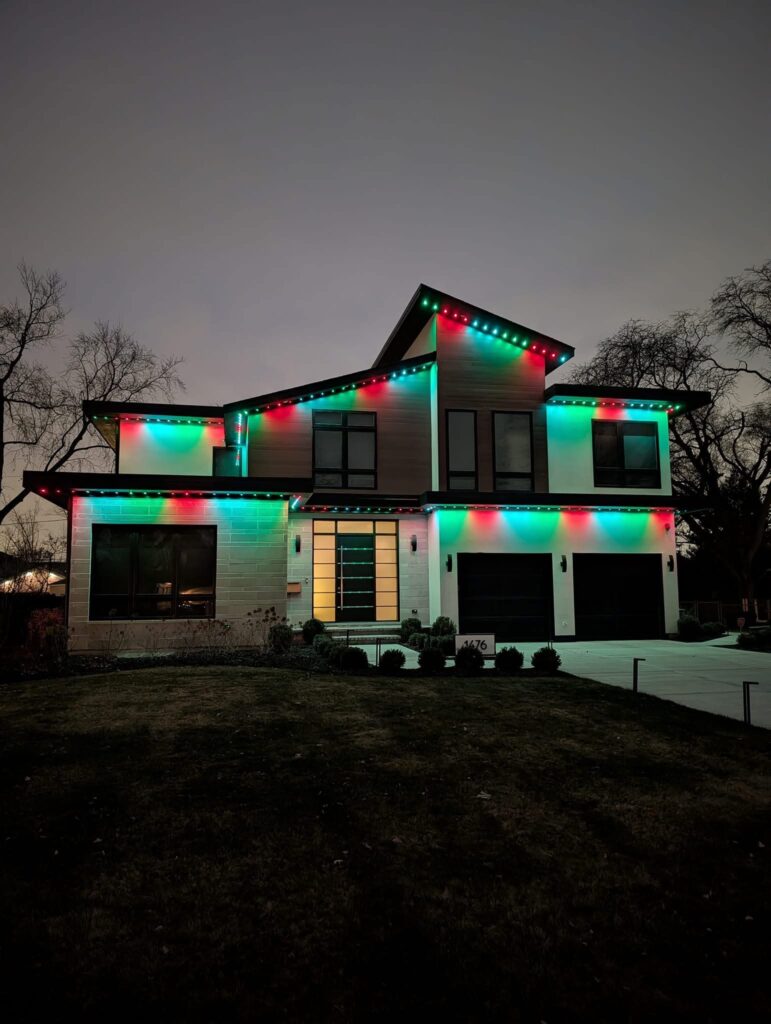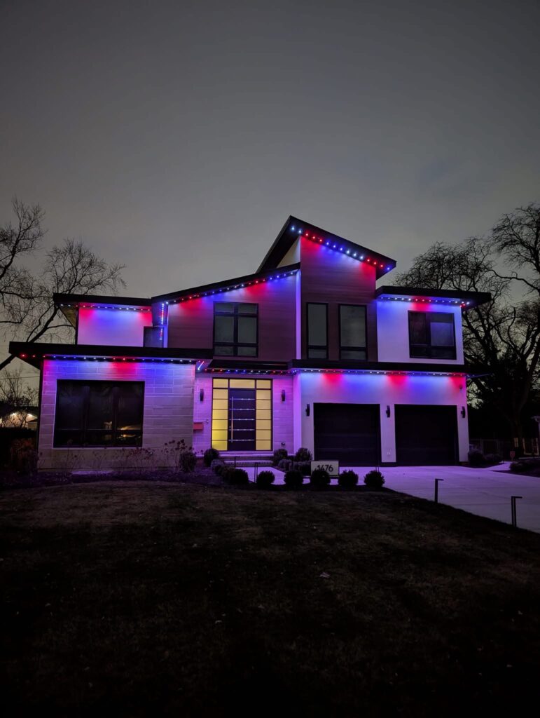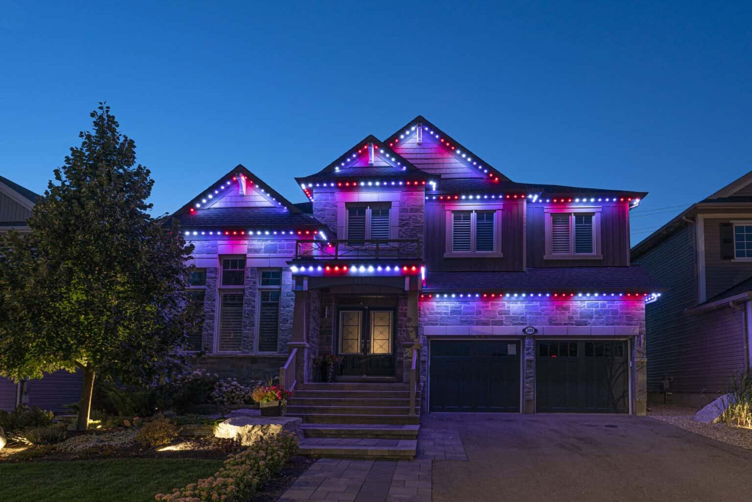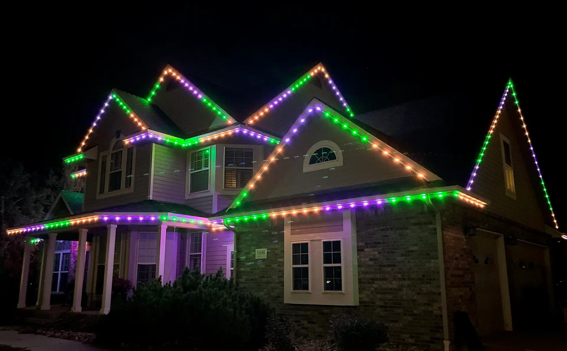 Permanent lighting (also called programmable RGB lighting or architectural lighting) is a commercial-grade LED system professionally mounted along your roofline. Unlike traditional holiday lights requiring annual installation, permanent lighting stays in place year-round and displays any color or pattern through a mobile app – from warm white accent lighting to bold holiday displays.