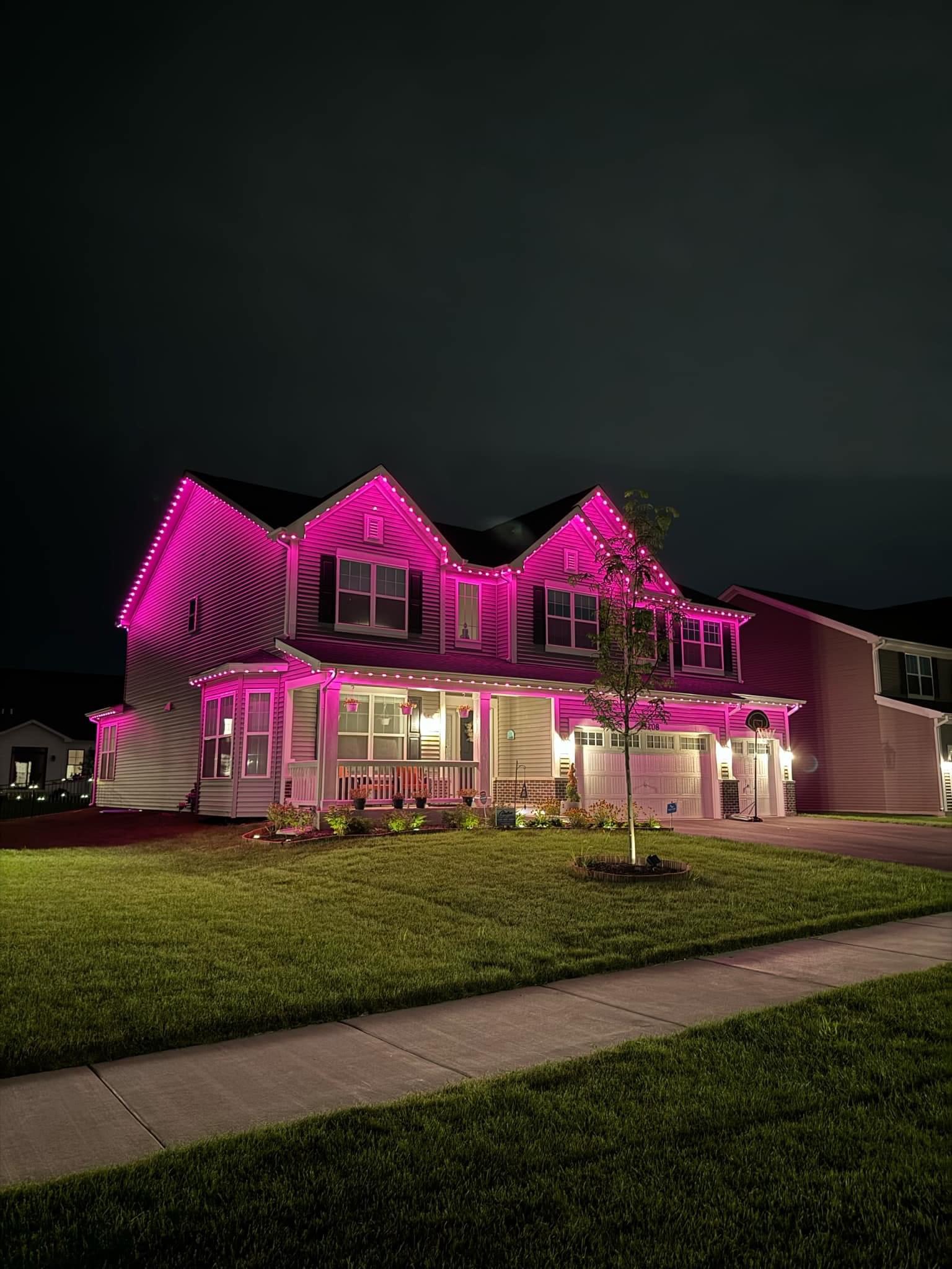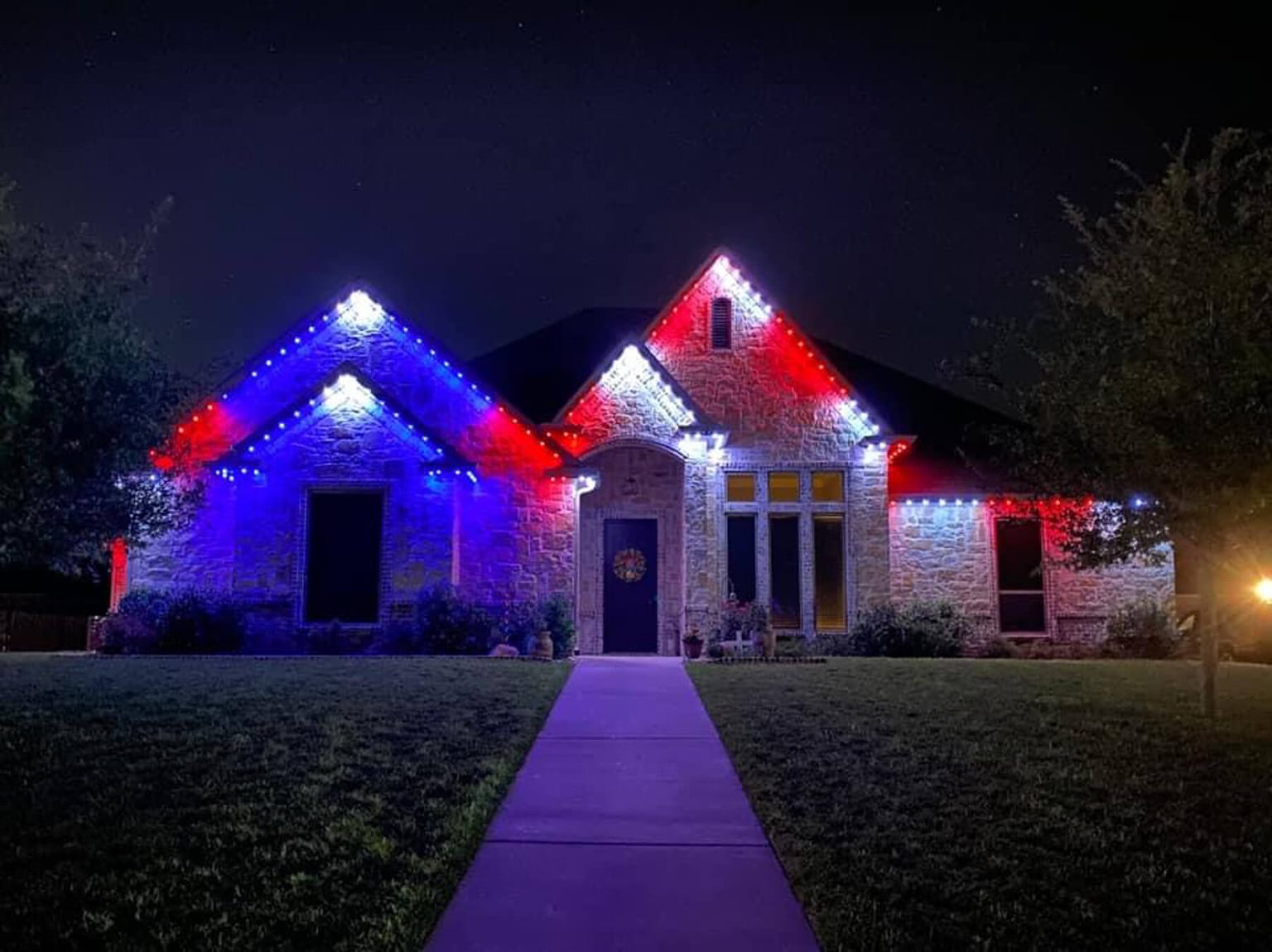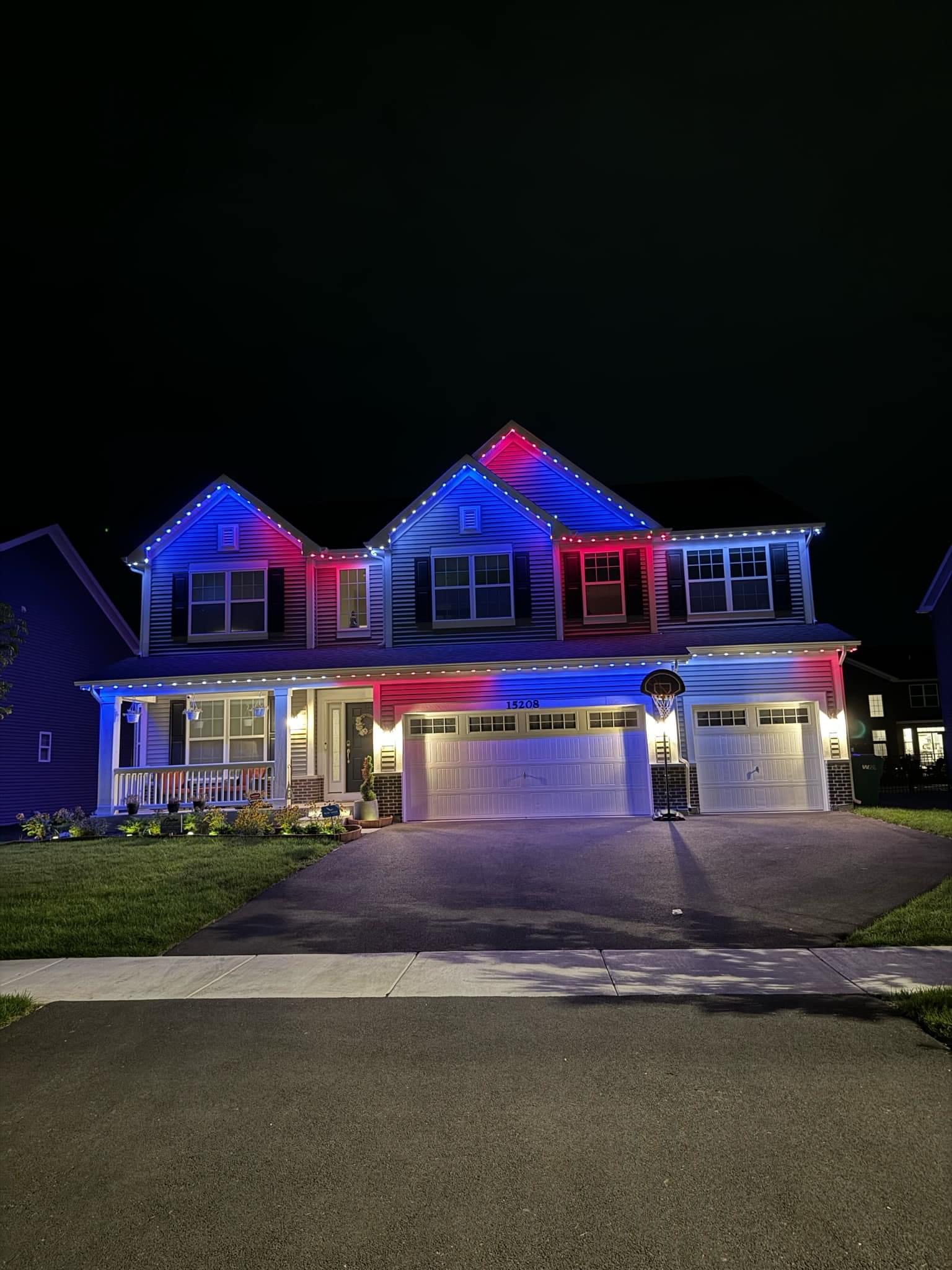 Permanent lighting (also called programmable RGB lighting or architectural lighting) is a commercial-grade LED system professionally mounted along your roofline. Unlike traditional holiday lights requiring annual installation, permanent lighting stays in place year-round and displays any color or pattern through a mobile app – from warm white accent lighting to bold holiday displays.